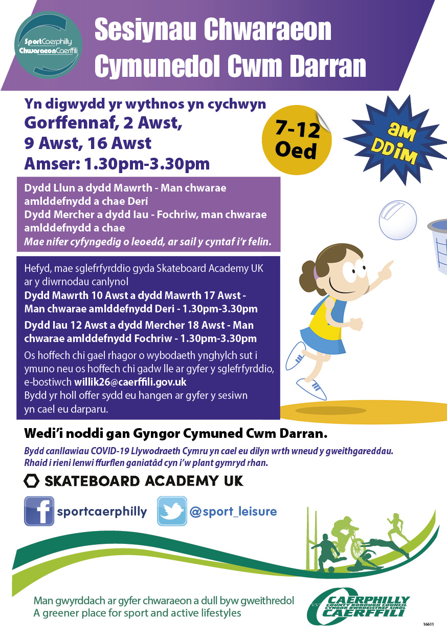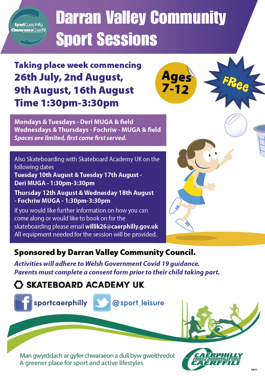 Children aged 7 to 12 – sports activities in the attached flyers. Caerphilly CBC will be distributing these to you this week. Activities follow Welsh Government Covid-19 guidance.